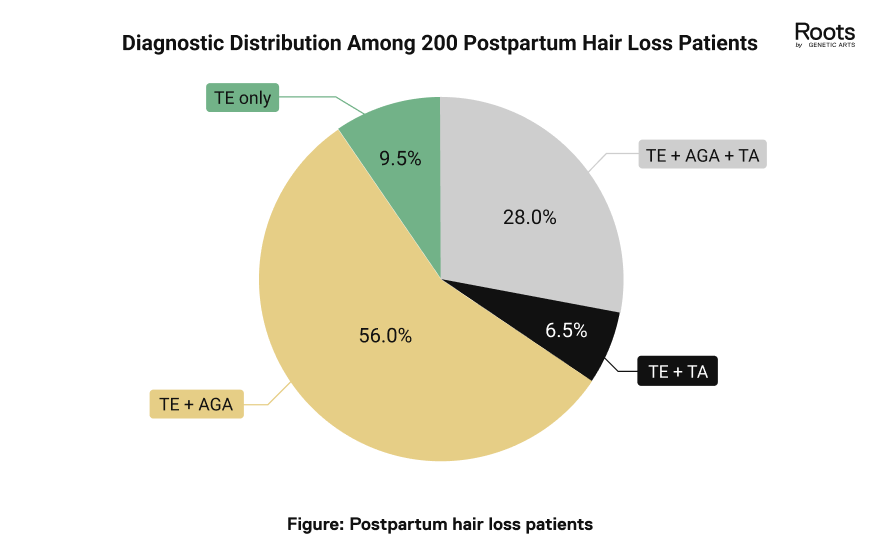The pie chart illustrates the diagnostic distribution among 200 postpartum hair loss patients in the study. It visually highlights that the majority (56%) were diagnosed with Telogen Effluvium (TE) combined with Androgenetic Alopecia (AGA), followed by TE + AGA + TA (28%), while isolated TE and TE + TA were less common 2.